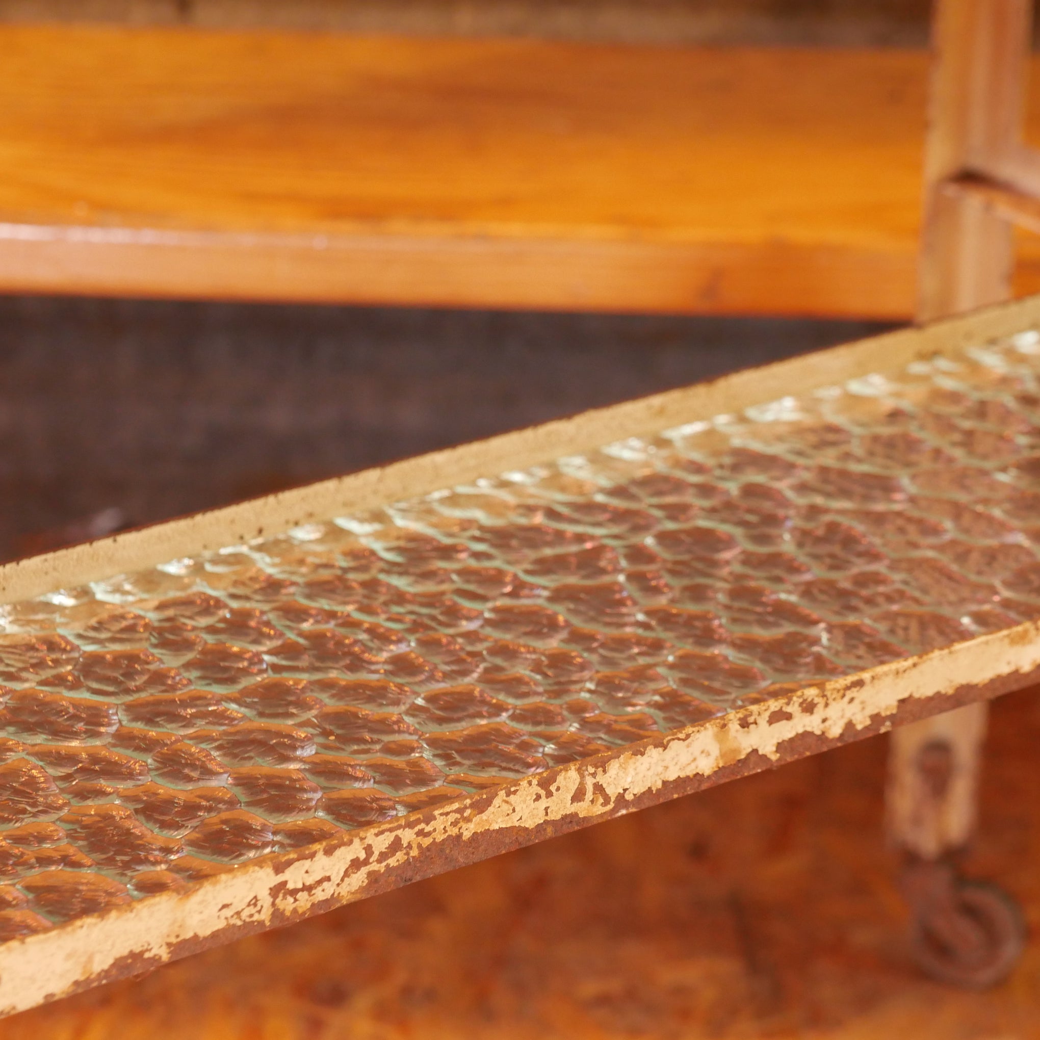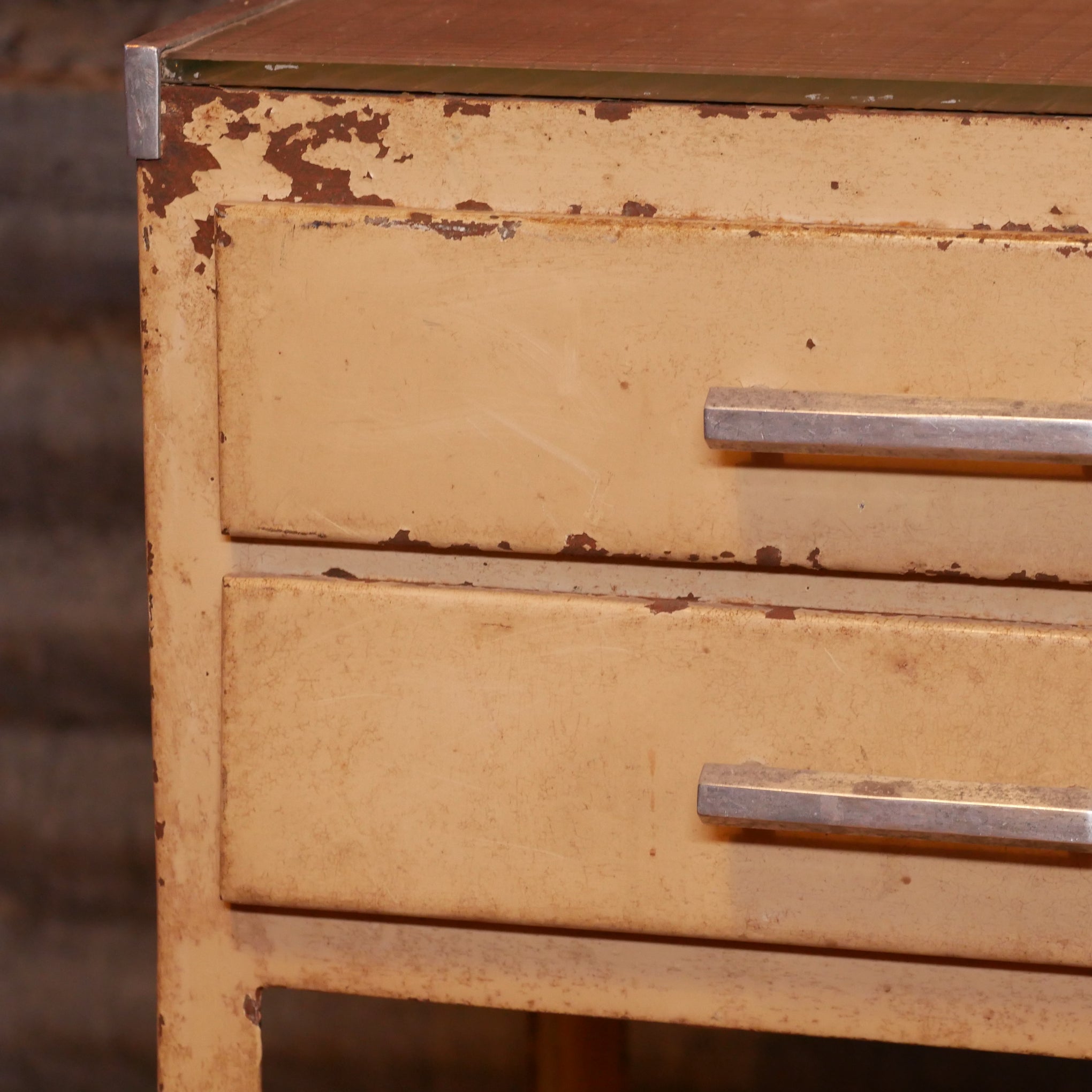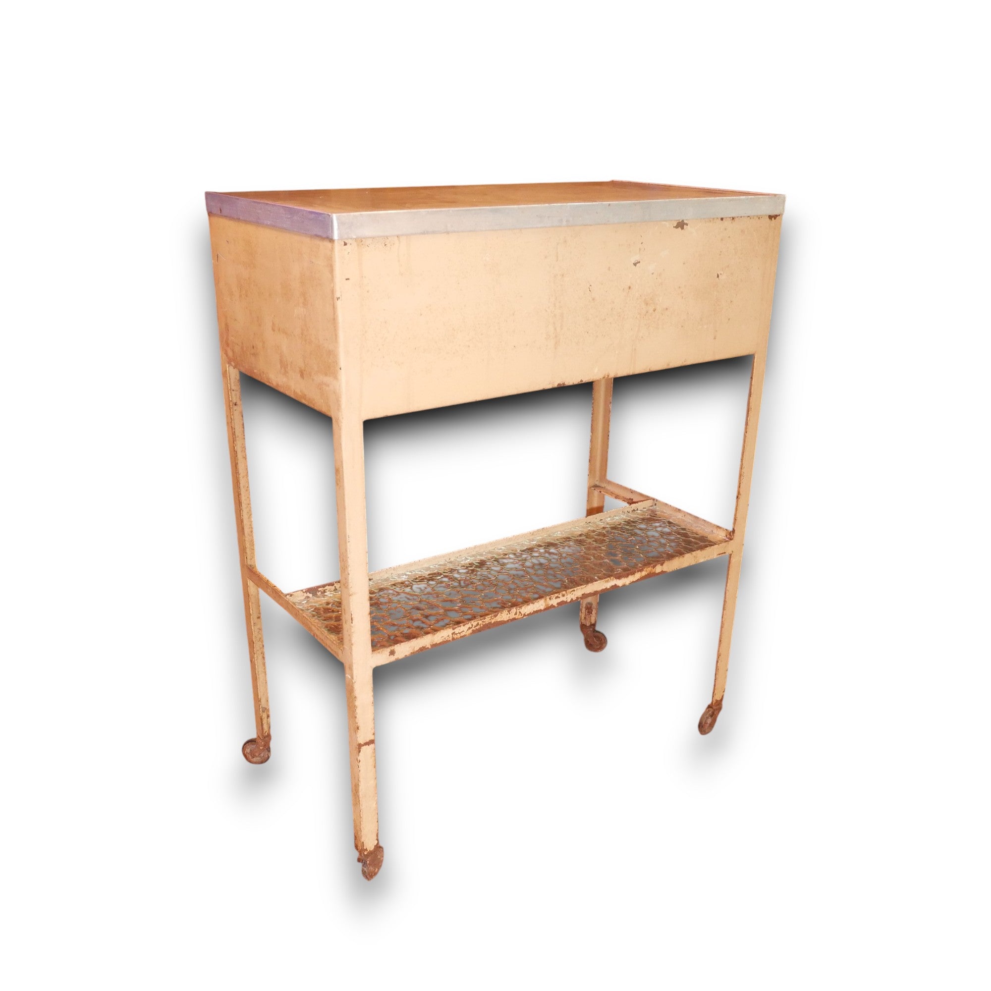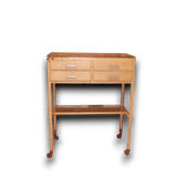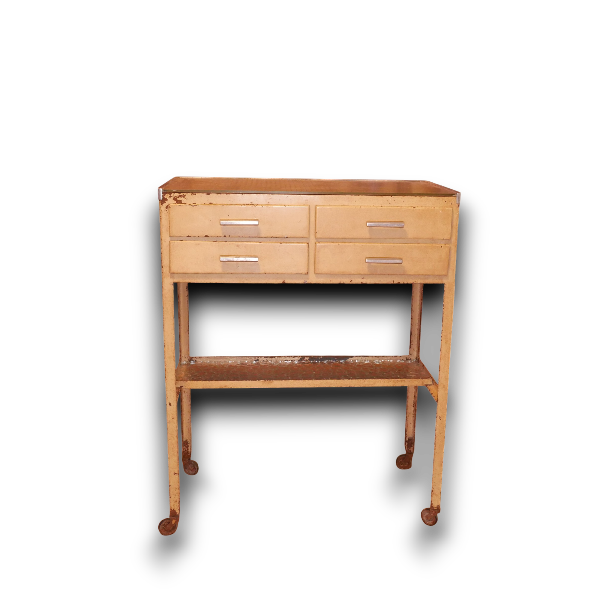 Meestal uitgerust met meerdere lades en open vakken voor het opbergen van tandartsinstrumenten. Met glazen platen voor hygiëne en duurzaamheid. Deze trolley heeft nog de originele glazen plaatjes.