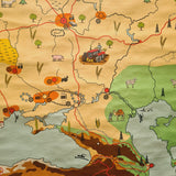 Gekleurde topografische thema kaarten (land‑/tuinbouw, industrie, verkeer, visserij etc.) die economische en geografische aspecten visueel verbinden